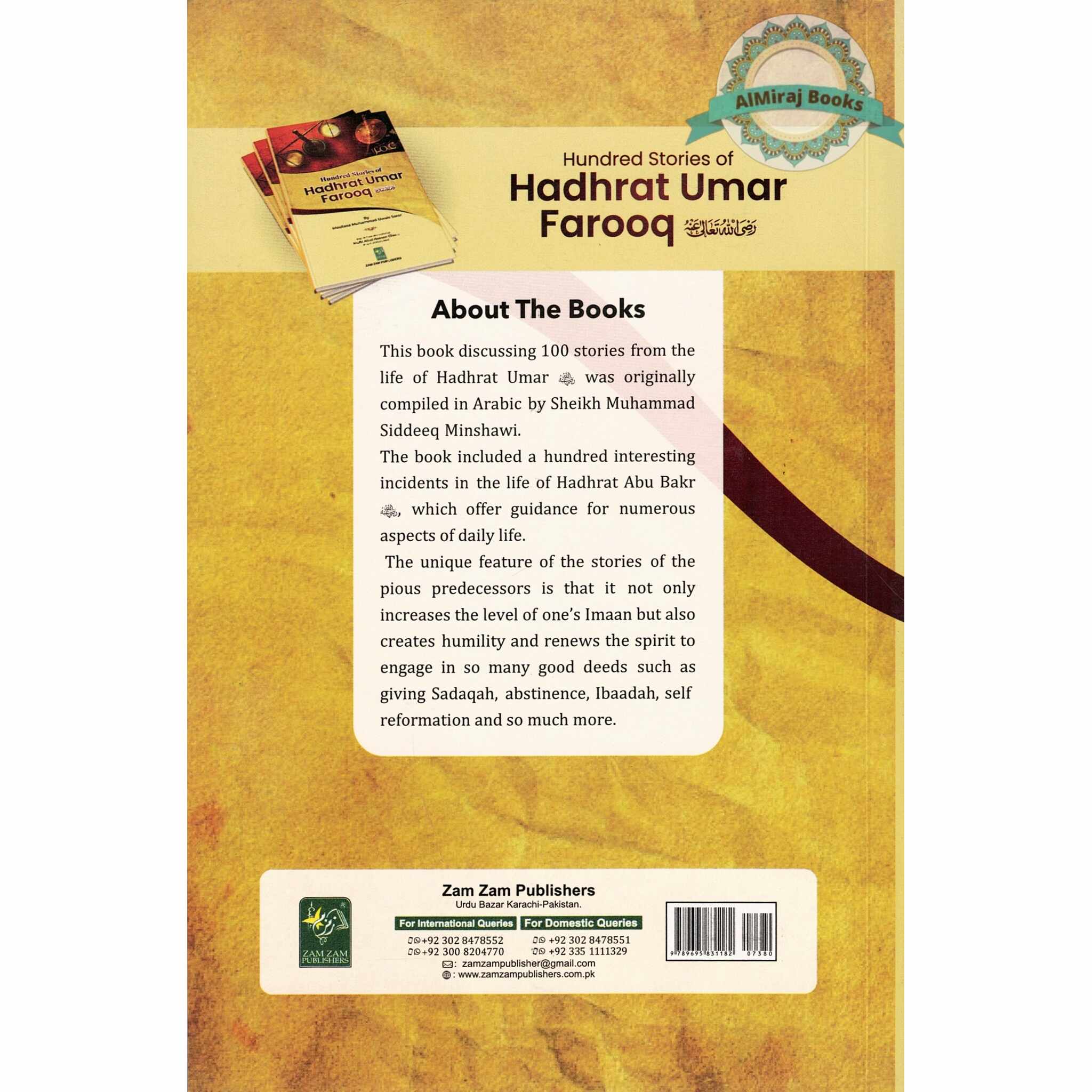 This book discussing 100 stories from the life of Hadhrat Umar was originally compiled in Arabic by Sheikh Muhammad Siddeeq Minshawi. The book included a hundred interesting incidents in the life of Hadhrat Abu Bakr which offer guidance for numerous aspects of daily life.