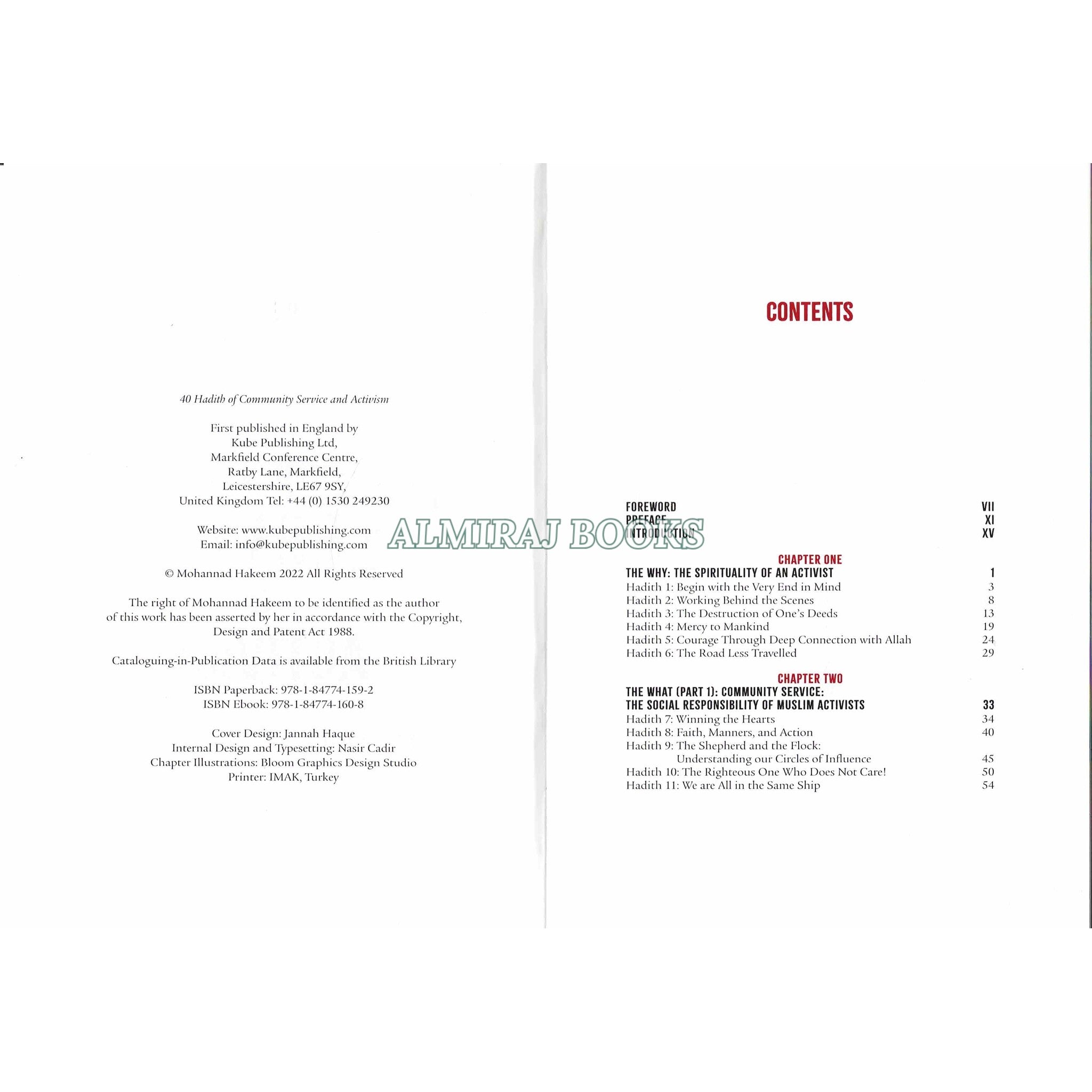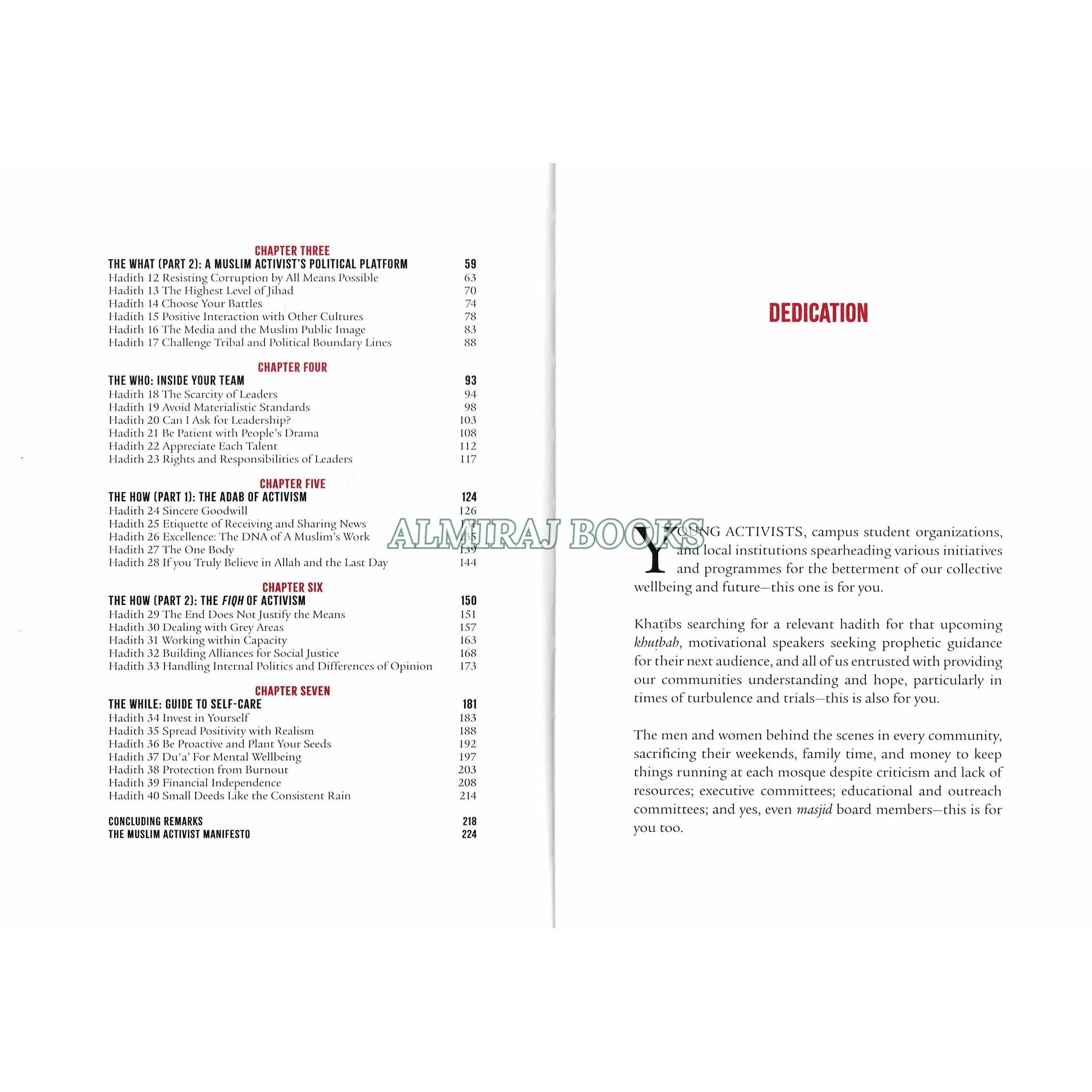 Dr. Mohammad Hakeem's book "40 Hadith on Community Service & Activism" is a collection of 40 Quranic verses that emphasize the importance of activism and community service in the Islamic faith. The book includes a commentary to clarify the significance and meaning of each hadith. Additionally, it offers a complete list of other sources for people looking for more information. For individuals who want to learn more about Islamic teachings on civic engagement and activity, this book is a priceless resourceThis book is meant to be a Muslim's handbook to change the world. It provides the most relevant Hadiths that Muslims in the 21st century and beyond need to maximize their potential, serve their community, and leave a legacy. Aided with a commentary and a list of actionable items for each hadith, these hadiths provide a framework that answers the most relevant questions for activists and community leaders: The WHY (The spiritual element), the WHAT (the social and political responsibility), the HOW (The Figh and Adab guidelines), the WHO (tips on building successful teams), and the WHILE (self-care advice). For all those who have goals beyond their own selves and aspire to make an impact, guided by prophetic wisdom, this book is for you!