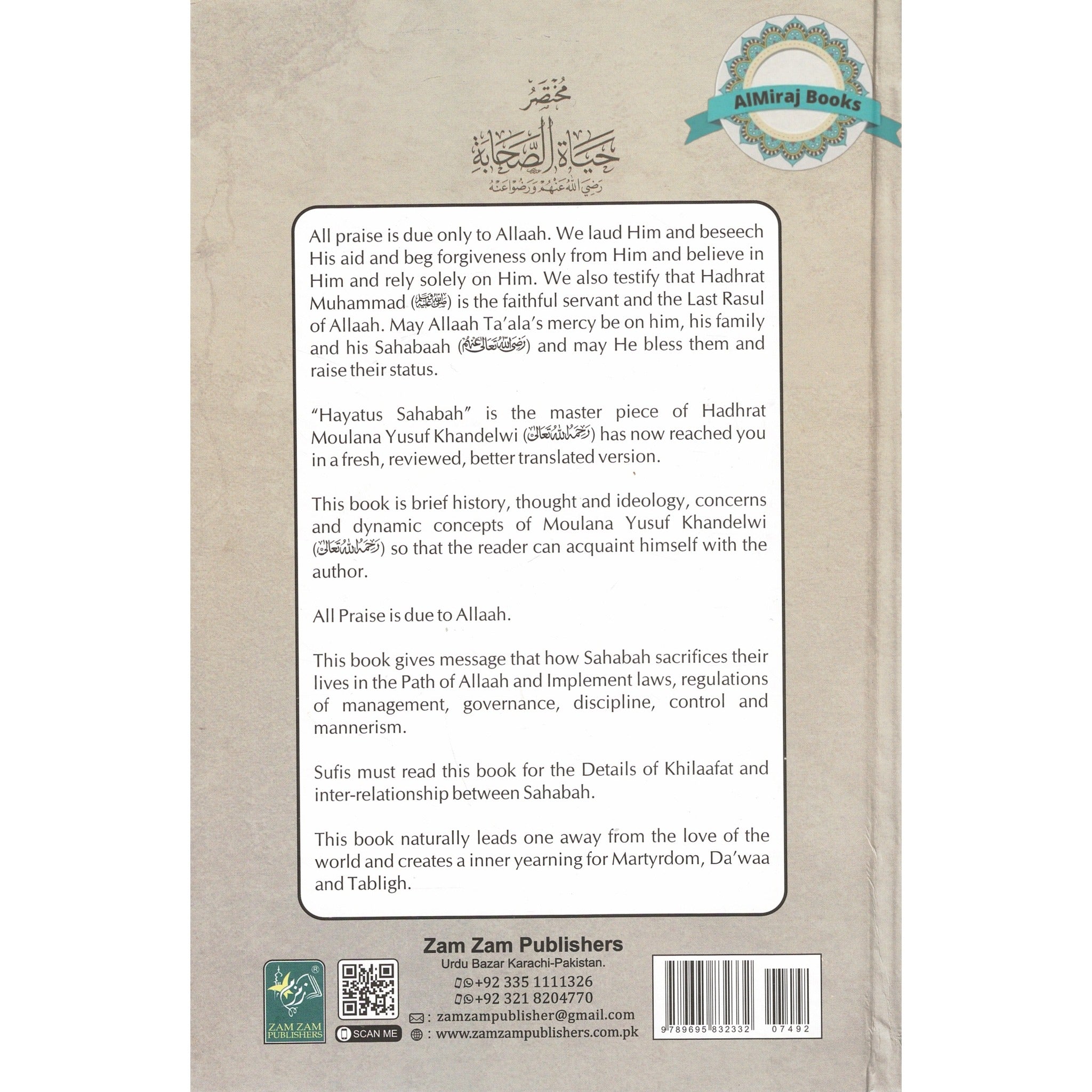 All praise is due only to Allaah. We laud Him and beseech His aid and beg forgiveness only from Him and believe in Him and rely solely on Him. We also testify that Hadhrat Muhammad (2) is the faithful servant and the Last Rasul of Allaah. May Allaah Ta'ala's mercy be on him, his family and his Sahabaah () and may He bless them and raise their status. "Hayatus Sahabah" is the master piece of Hadhrat Moulana Yusuf Khandelwi () has now reached you in a fresh, reviewed, better translated version. This book is brief history, thought and ideology, concerns and dynamic concepts of Moulana Yusuf Khandelwi () so that the reader can acquaint himself with the author. All Praise is due to Allaah. This book gives message that how Sahabah sacrifices their lives in the Path of Allaah and Implement laws, regulations of management, governance, discipline, control and mannerism. Sufis must read this book for the Details of Khilaafat and inter-relationship between Sahabah. This book naturally leads one away from the love of the world and creates a inner yearning for Martyrdom, Da'waa and Tabligh.
