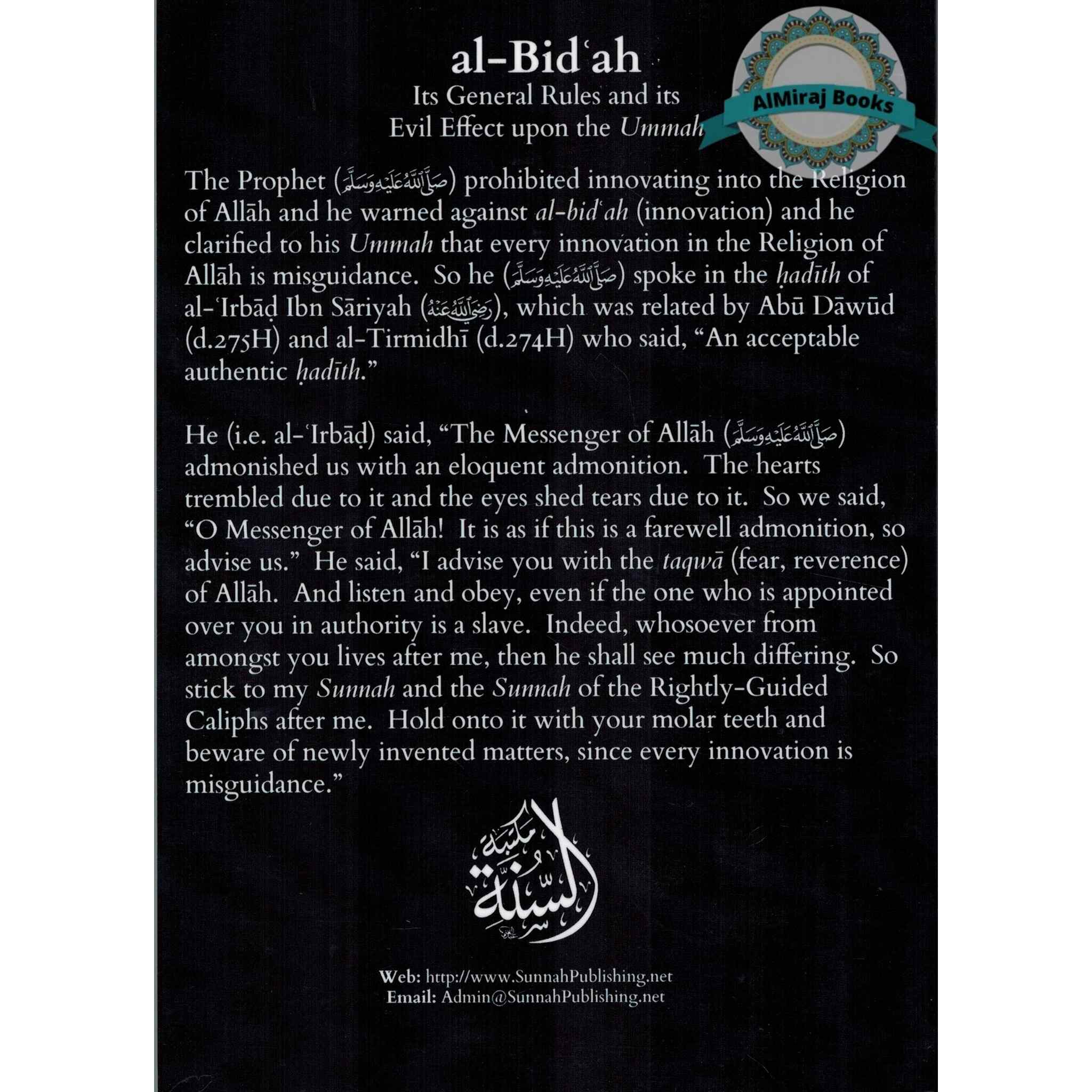 Dr. Ali ibn Muhammad ibn Nasir al Faqihi's "Al-Bidah: Its General Rules and its Evil Effect on the Ummah" is a scholarly discussion of the notion of Bid'ah (innovation) within the Islamic setting. Dr. Ali aims to uncover the complexities of Bid'ah in this illuminating study, analyzing its general principles and the destructive influence it can have on the unity and integrity of the Muslim community (Ummah). The author provides readers with a complete explanation of the origins, manifestations, and implications of Bid'ah by drawing on Quranic texts, Hadith, and historical context.