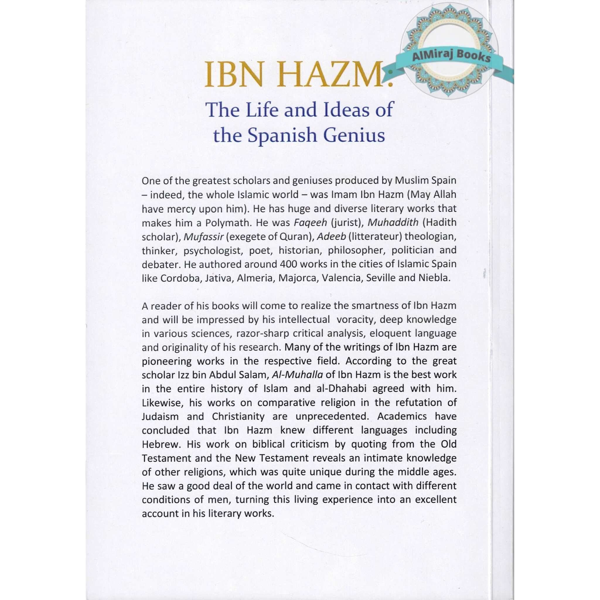 The fascinating book "Ibn Hazm: The Life and Ideas of the Spanish Genius" by Syed Nooruzzuha Barmawar explores the extraordinary life and intellectual impact of Ibn Hazm. Its chapters extensively examine Ibn Hazm's achievements as one of the foremost intellectuals and academics of the Islamic world. Ibn Hazm's life is insightfully described in the first of the book's two sections, which are separated into two sections. Readers are taken on a voyage through the significant incidents and experiences that molded his amazing existence, from his birth in Cordoba in 994 to his passing in 1064. Ibn Hazm's life and academic interests are highlighted in the book by a number of important issues that are covered. These consist of: