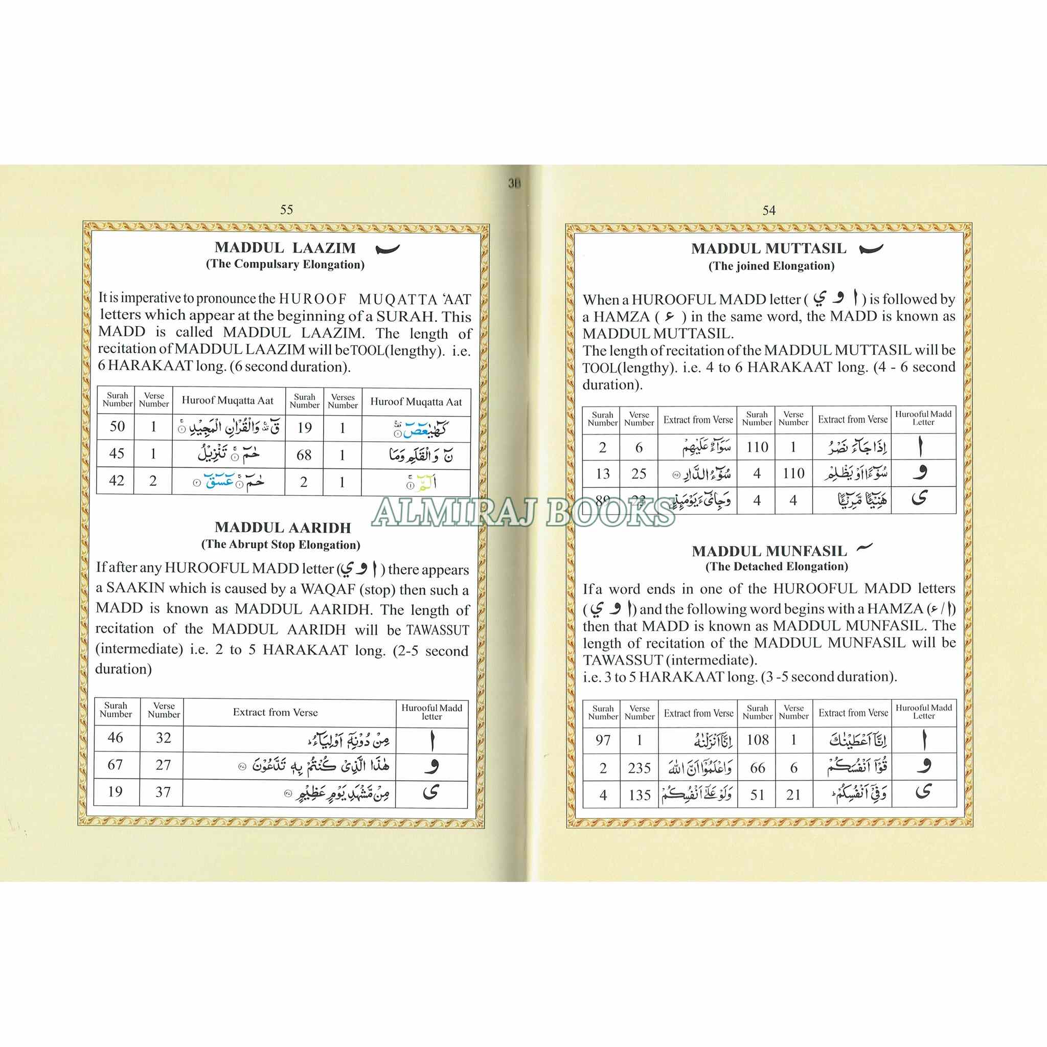 A specific edition or format of the Juzu Amma section of the Quran is referred to as "Juzu Amma with Colour Coded Tajweed Rules in English [Large Size]". The final and thirty-first chapter of the Quran, known as Juzu Amma, is made up of brief chapters or surahs. Muslims frequently recite and memorize it, particularly during daily prayers and religious gatherings. The color coded Juz is intended to facilitate and enhance the reading of the Qur'an with tajweed. It is produced by color coding the various rules. For example where ikhfa is to be observed, the word is highlighted with blue; where qalqala is to be observed red is used. A legend at the bottom of every page describes the color codes providing for a quick reference. A supplement at the end describes the rules of tajweed in detail and explains the color coding system. Large font. Art paper. Produced especially for children
