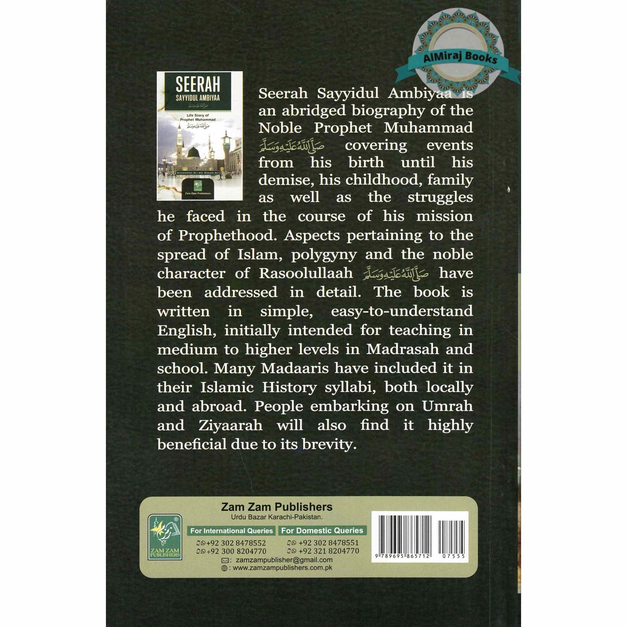 Seerah Sayyidul Ambiyaa is an abridged biography of the Noble Prophet Muhammad events covering from his birth until his demise, his childhood, family as well as the struggles he faced in the course of his mission of Prophethood. Aspects pertaining to the spread of Islam, polygyny and the noble character of Rasoolullaah have been addressed in detail. The book is written in simple, easy-to-understand English, initially intended for teaching in medium to higher levels in Madrasah and school. Many Madaaris have included it in their Islamic History syllabi, both locally and abroad. People embarking on Umrah and Ziyaarah will also find it highly beneficial due to its brevity.