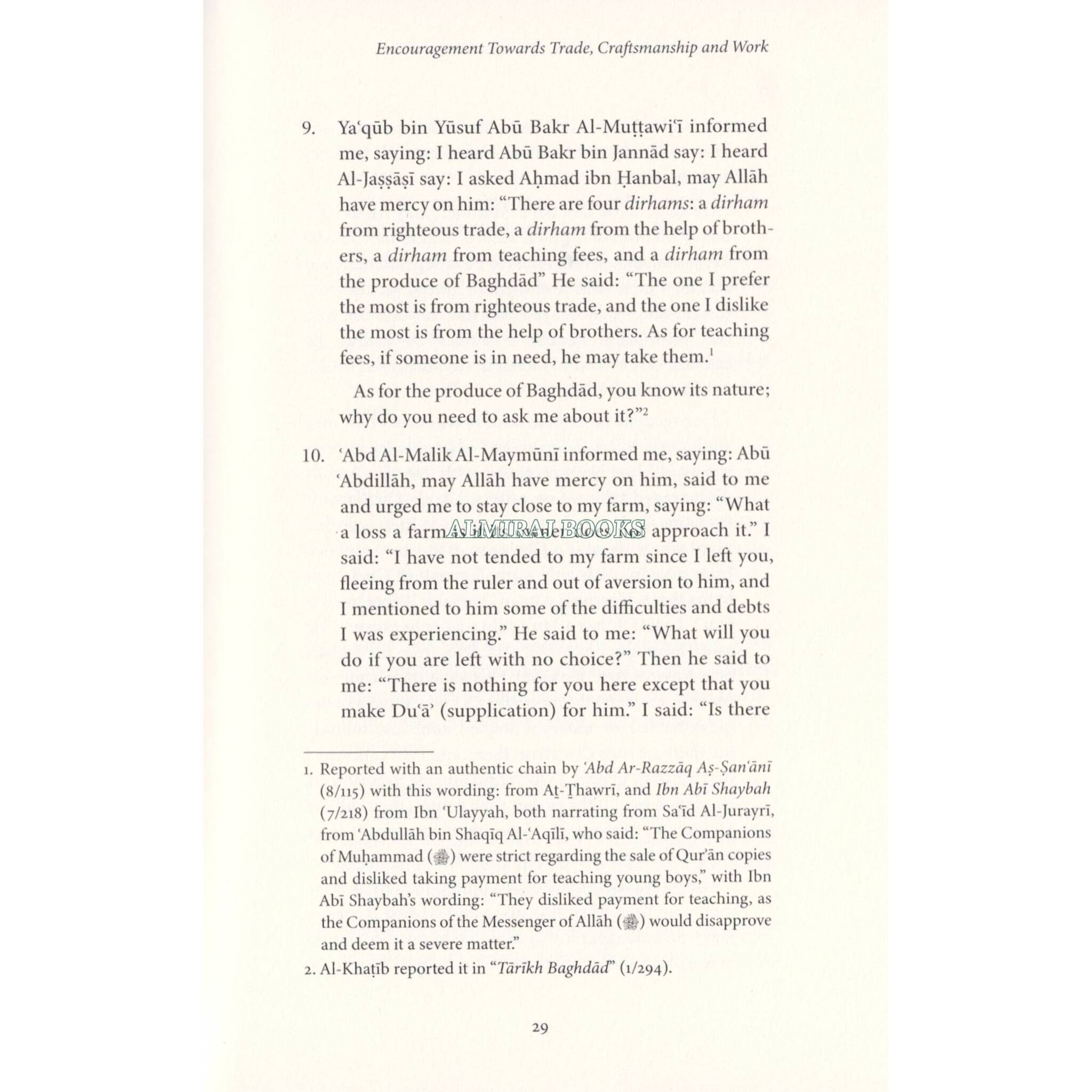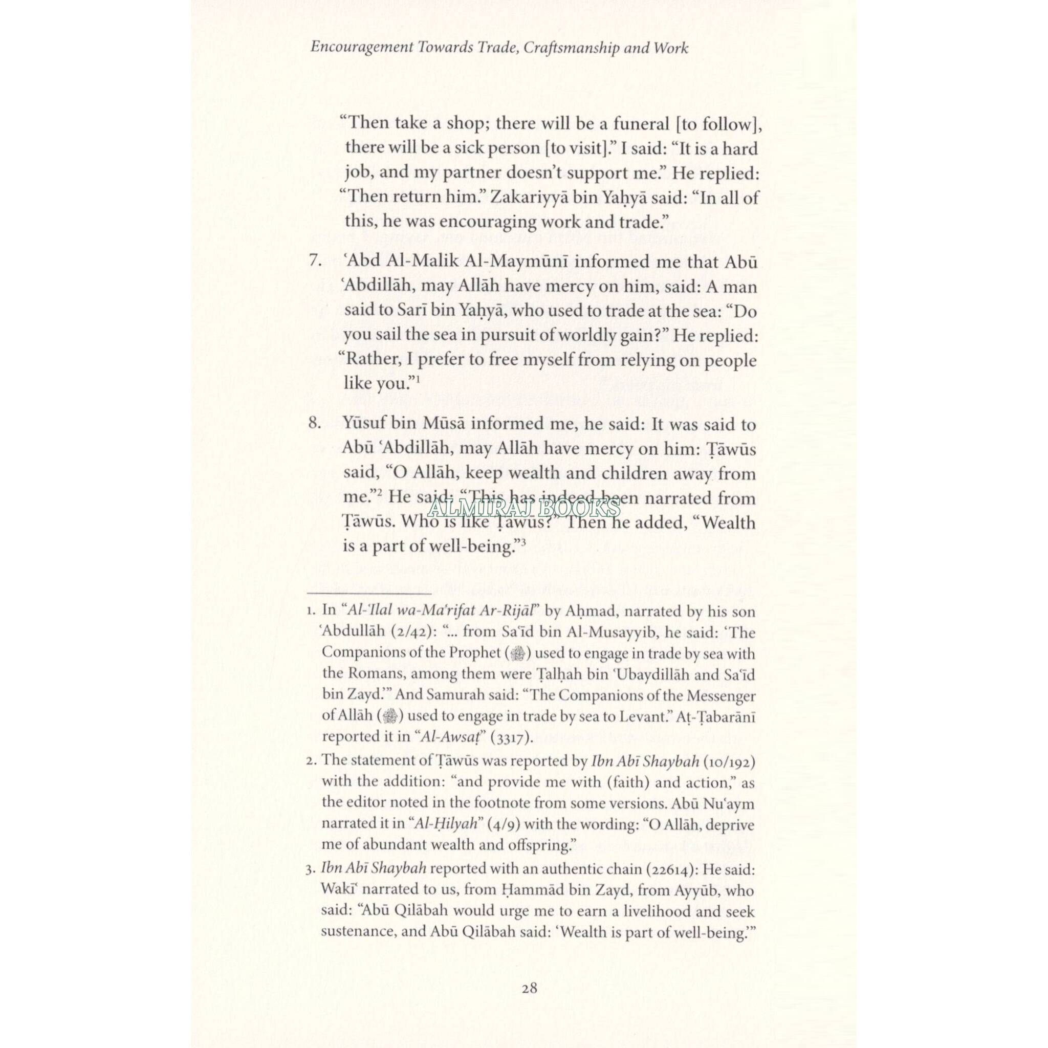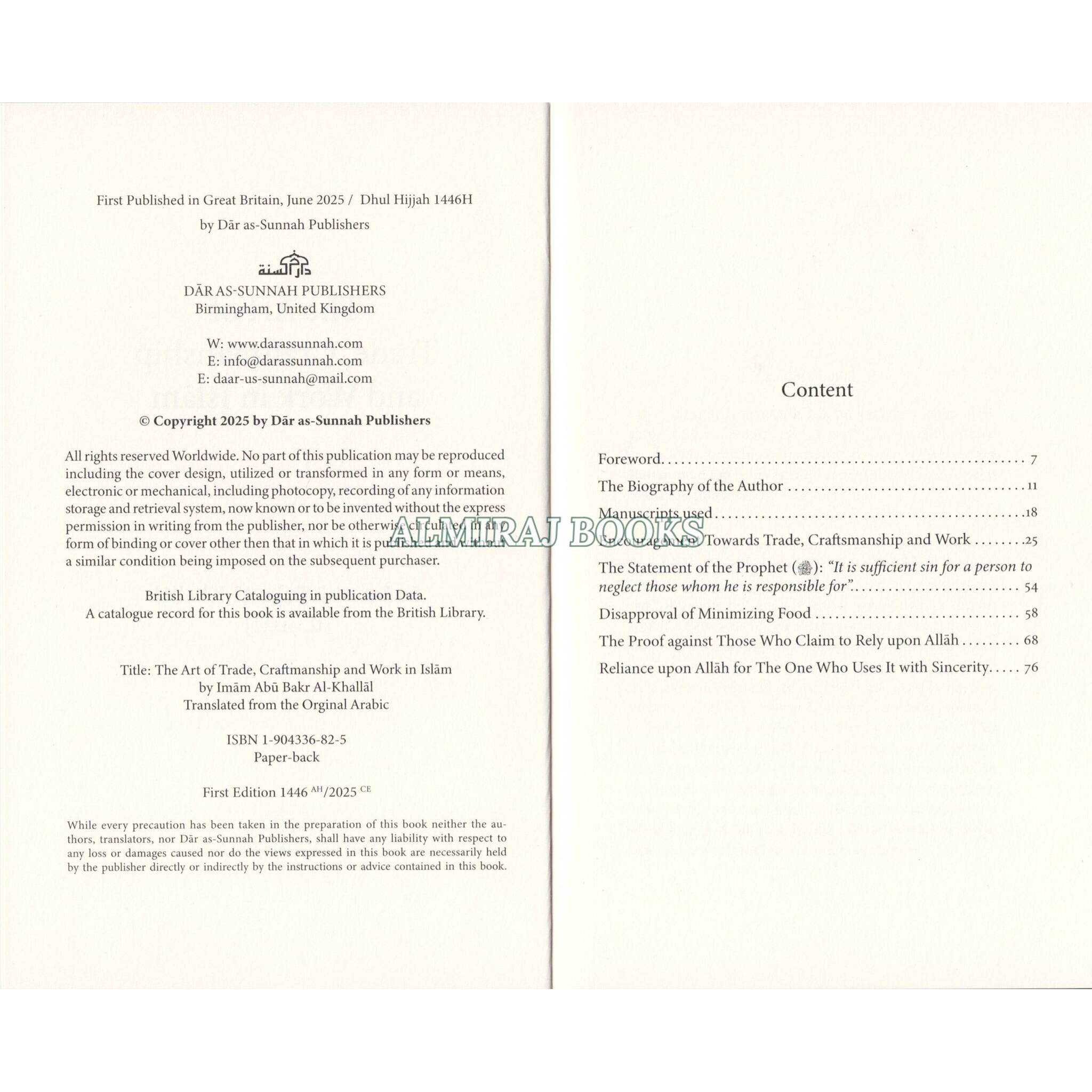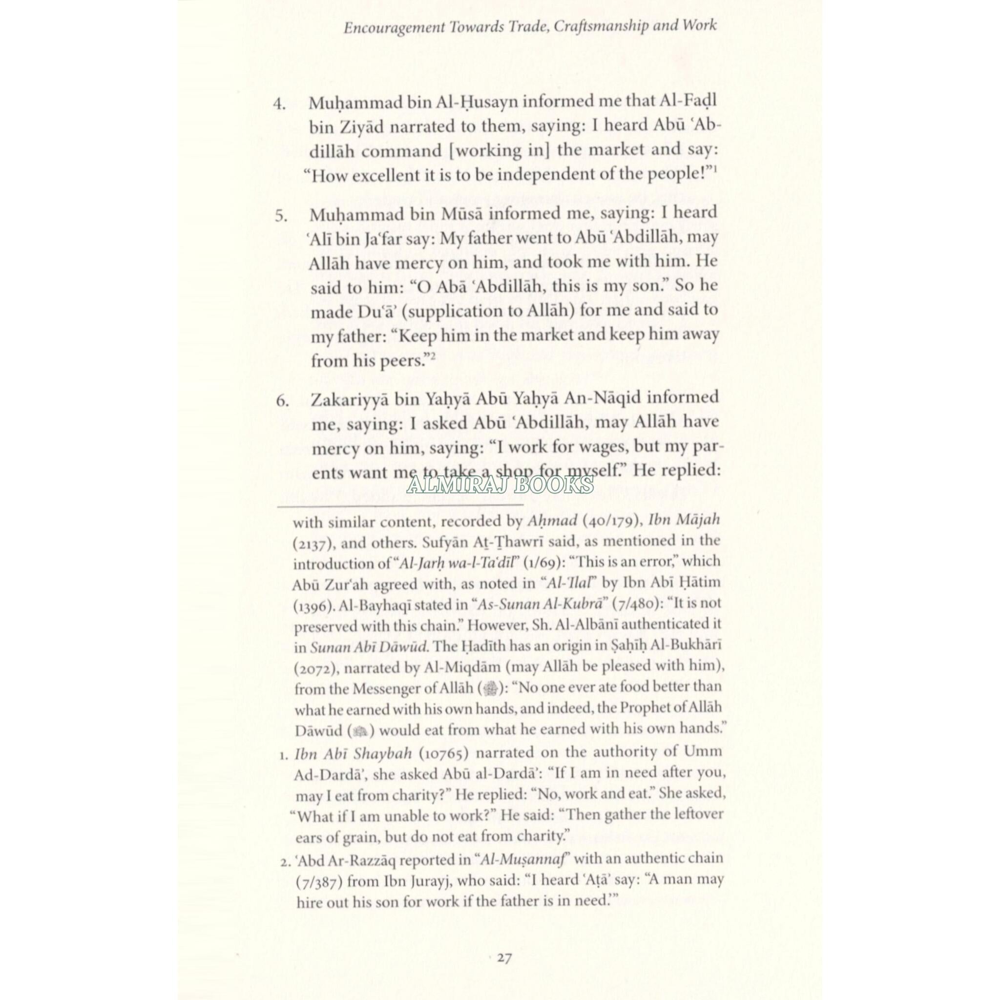 The Messenger of Allah (said: "No one has ever eaten better food than that which he has earned by working with his own hands. The Prophet of Allah, Dawid (David), used to eat from the earnings of his manual labour." Sabib Al-Bukhari # 2072 Know O Muslim, may Allah have mercy upon you, that in Islam, the concept of earning a livelihood through honest work is not just recommended but is highly encouraged, highlighting its role as an essential part of living a responsible and beneficial life. Seeking provision and engaging in business, trade, or craftsmanship is viewed as praiseworthy and beneficial to one's family and the community at large For this reason, the book before you is an important work highlighting the importance of earning a wholesome living and working to build a better future. The author gathers verses of the Qur'an, sayings of the Messenger of Allah statements and actions of esteemed scholars of Islam and narrations from the early generations that emphasise the value of business, trade and work and warn against thoor who abandon it and sit idly, Working, trading, and mastering a skill is a mark of a believer-by which not only does one benefit themself but benefits society; aids Islam and the Muslim community.