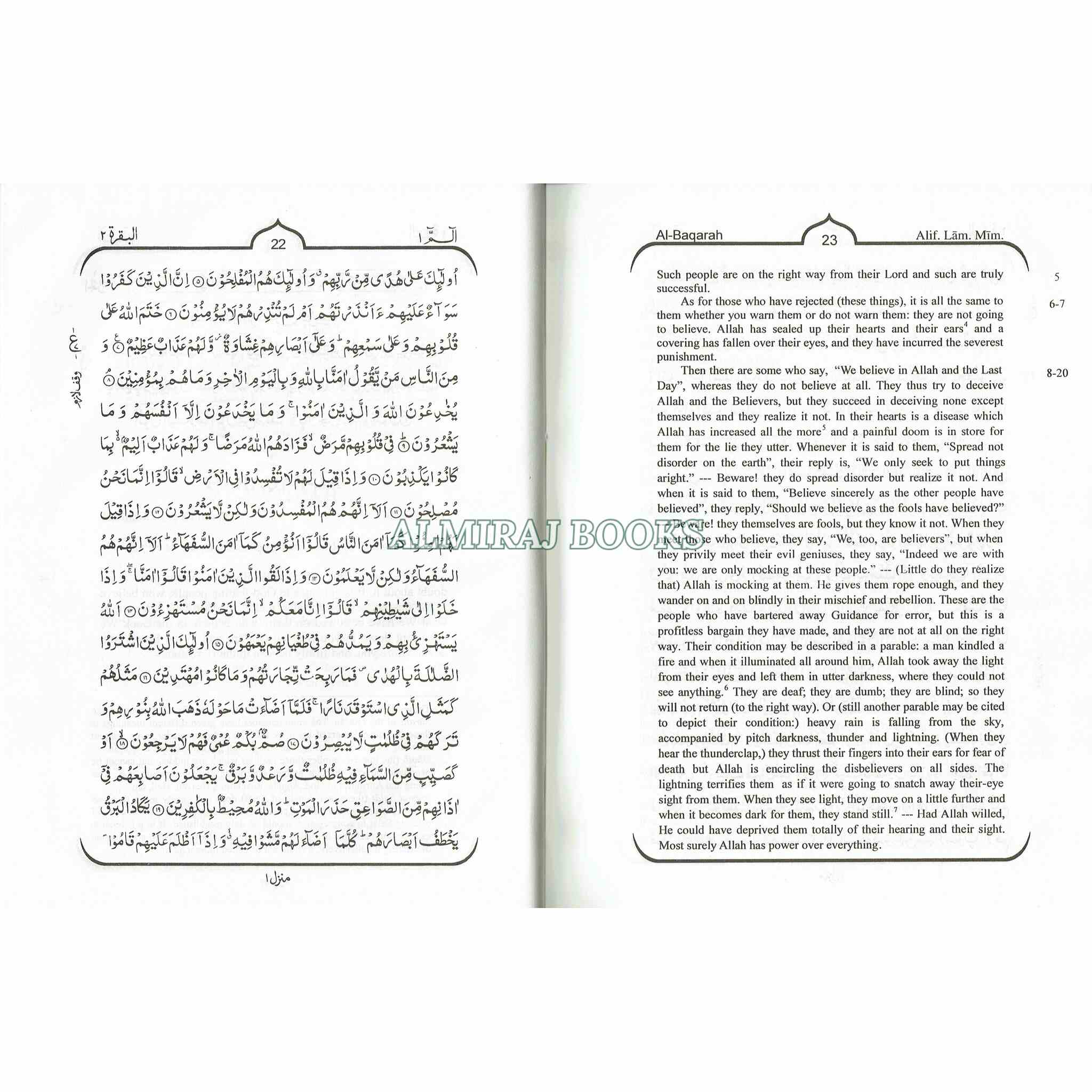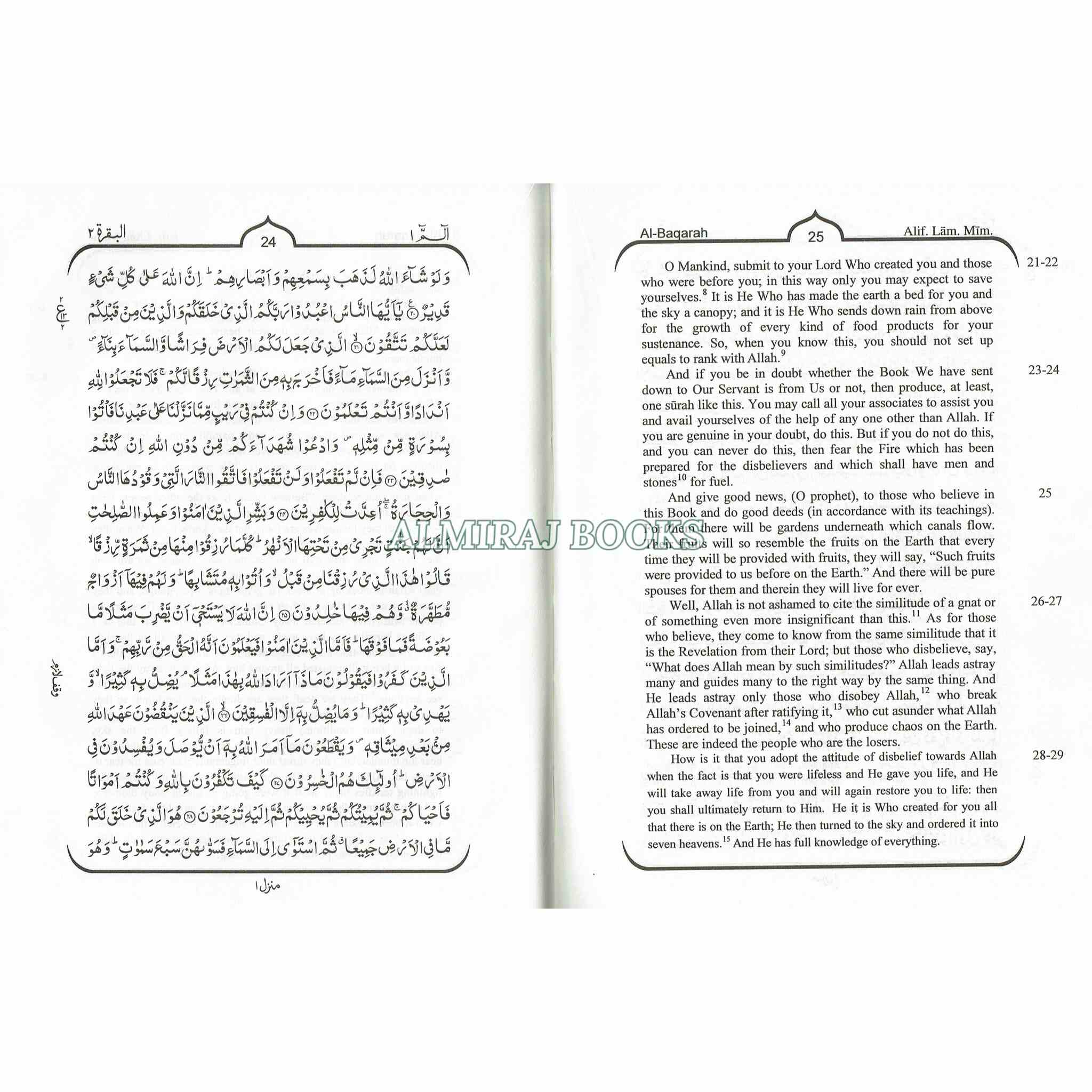 The original Arabic text of the Quran is displayed alongside the English translation. This allows readers to read the translation and comments while reciting and comparing the Arabic text.