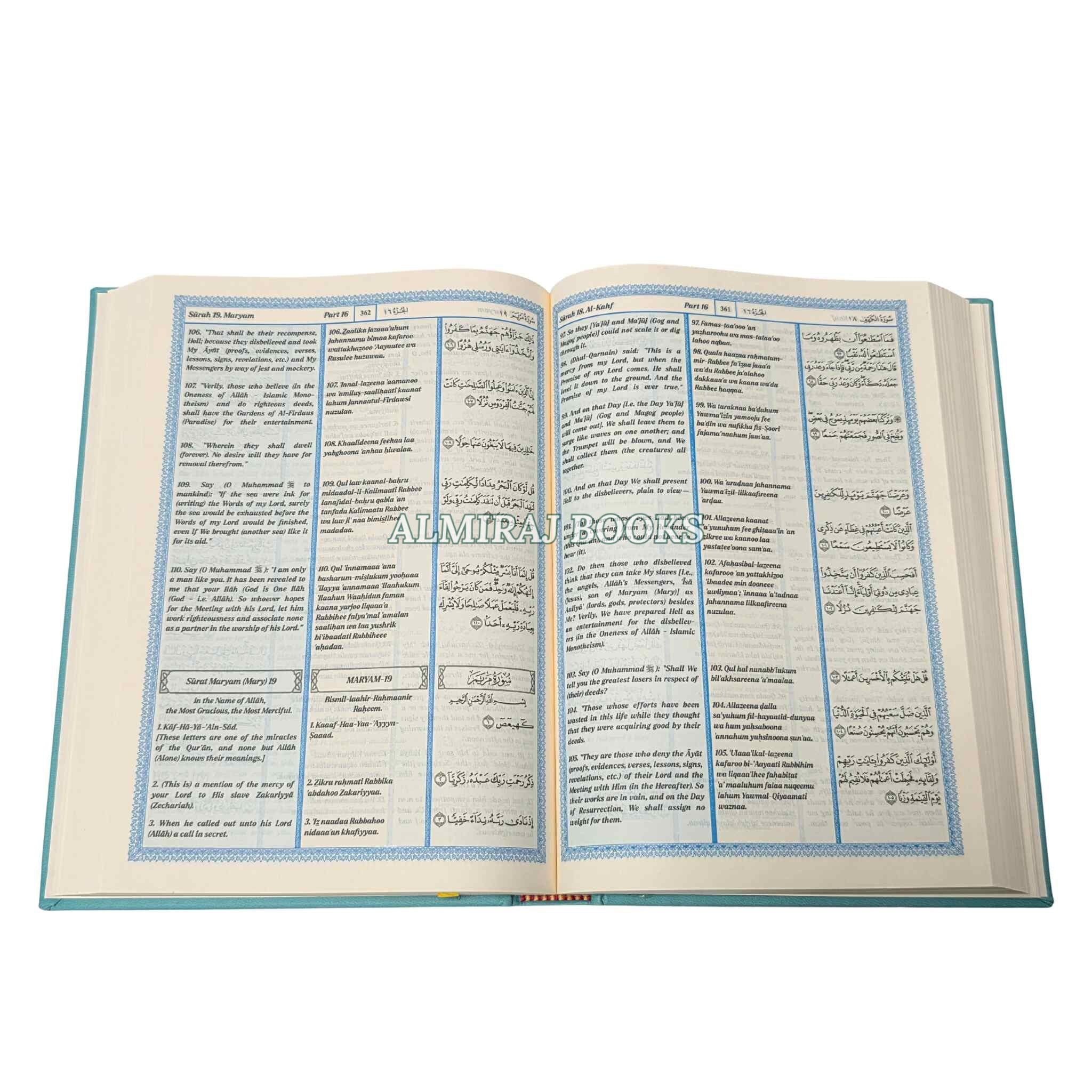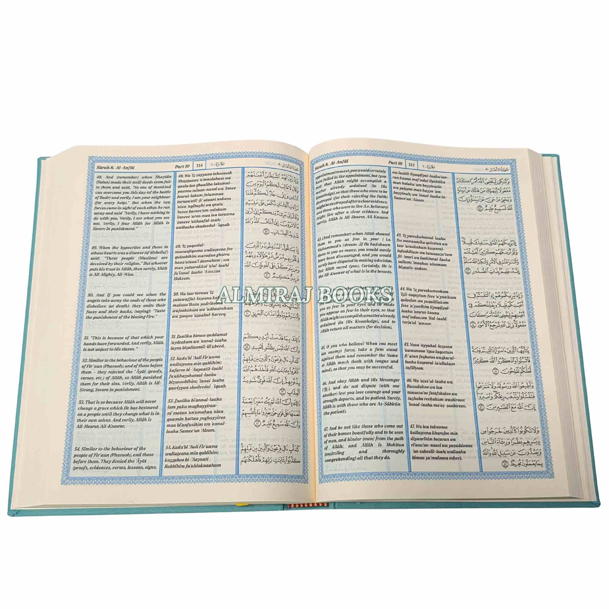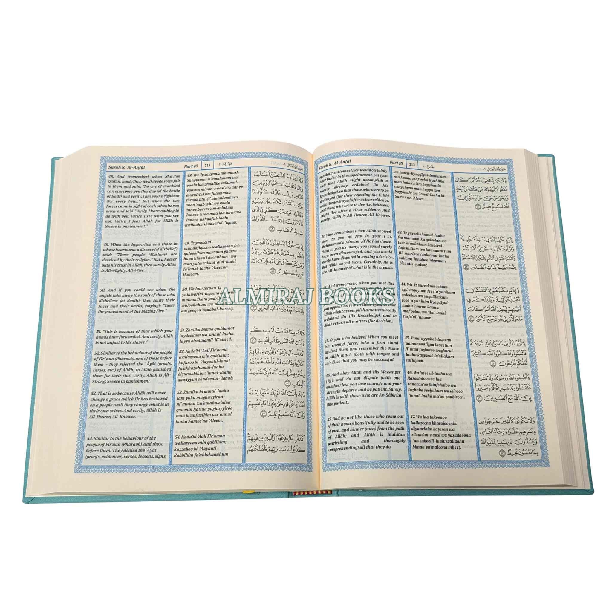 The heavenly message is presented in three different formats in this special edition of The Noble Quran: the Arabic original, a transliteration into Roman type, and an English translation based on the famous King Fahad Compound style. The transliteration, which was created specifically for students and non-Arabic speakers, enables readers to precisely recite the Quran while gradually getting familiar with the Arabic alphabet.