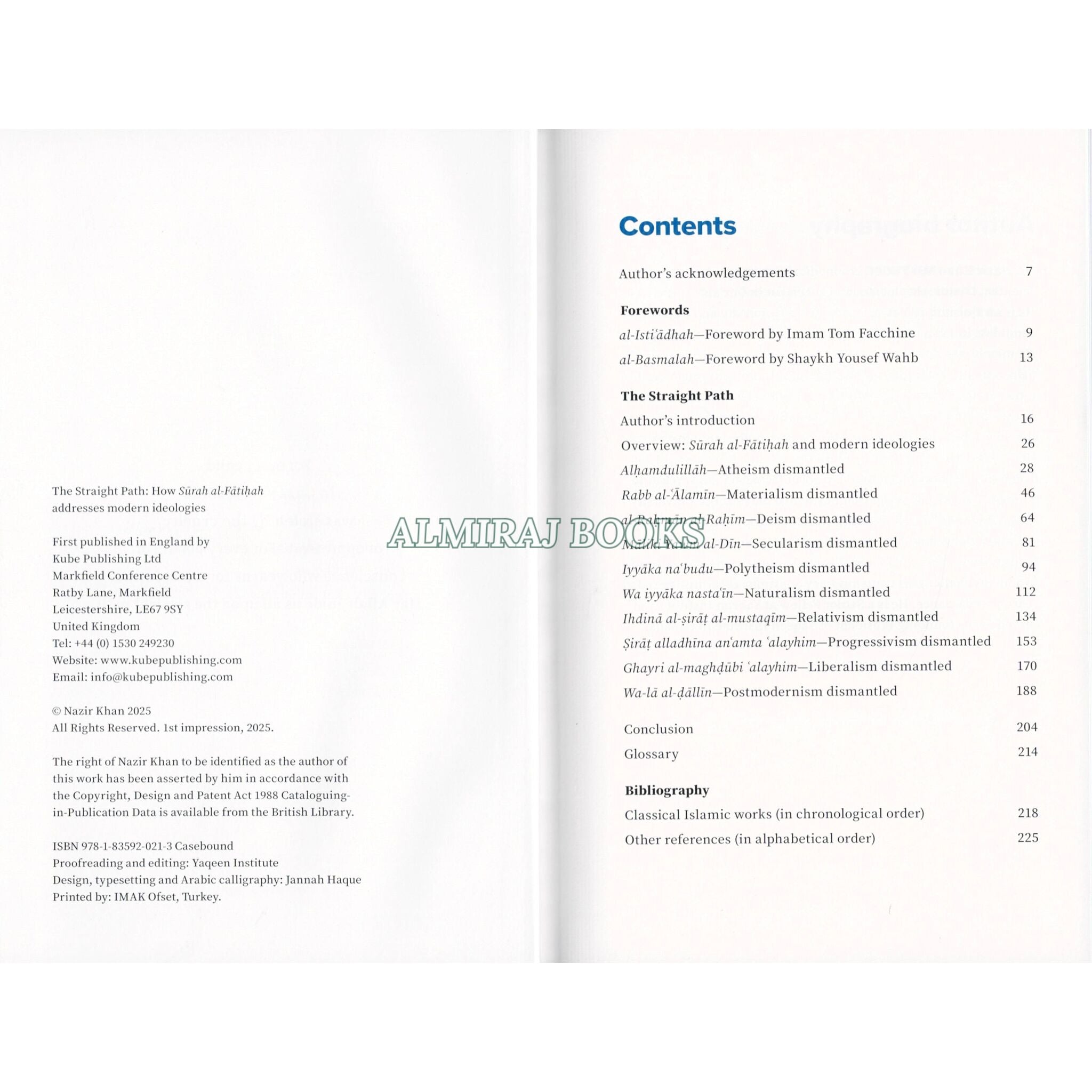 What is the meaning of Surah al-Fatihah? Muslims recite this opening chapter of the Qur'an at least 17 times daily in their prayers. It's a prayer for guidance and a source of healing. But are we letting it shape the way we see our world? The Straight Path offers a bold perspective, showing how Sürah al-Fatihah directly challenges the dominant ideologies of our time- ideologies that underpin the confusion, injustice, and even atrocities we see today. Nowhere is this failure more evident than in the genocide in Gaza, a grim example of the ethical collapse of secular modernity. Examine ten major ideologies-atheism, materialism, deism, secularism, polytheism, naturalism, relativism, progressivism, liberalism, and postmodernism-and discover how Surah al-Fatihah dismantles each one, offering clarity where they sow confusion. Through the process of knowledge decolonisation, we are invited to free our minds of oppressive systems of thought and return to the ethical worldview of Islam.
